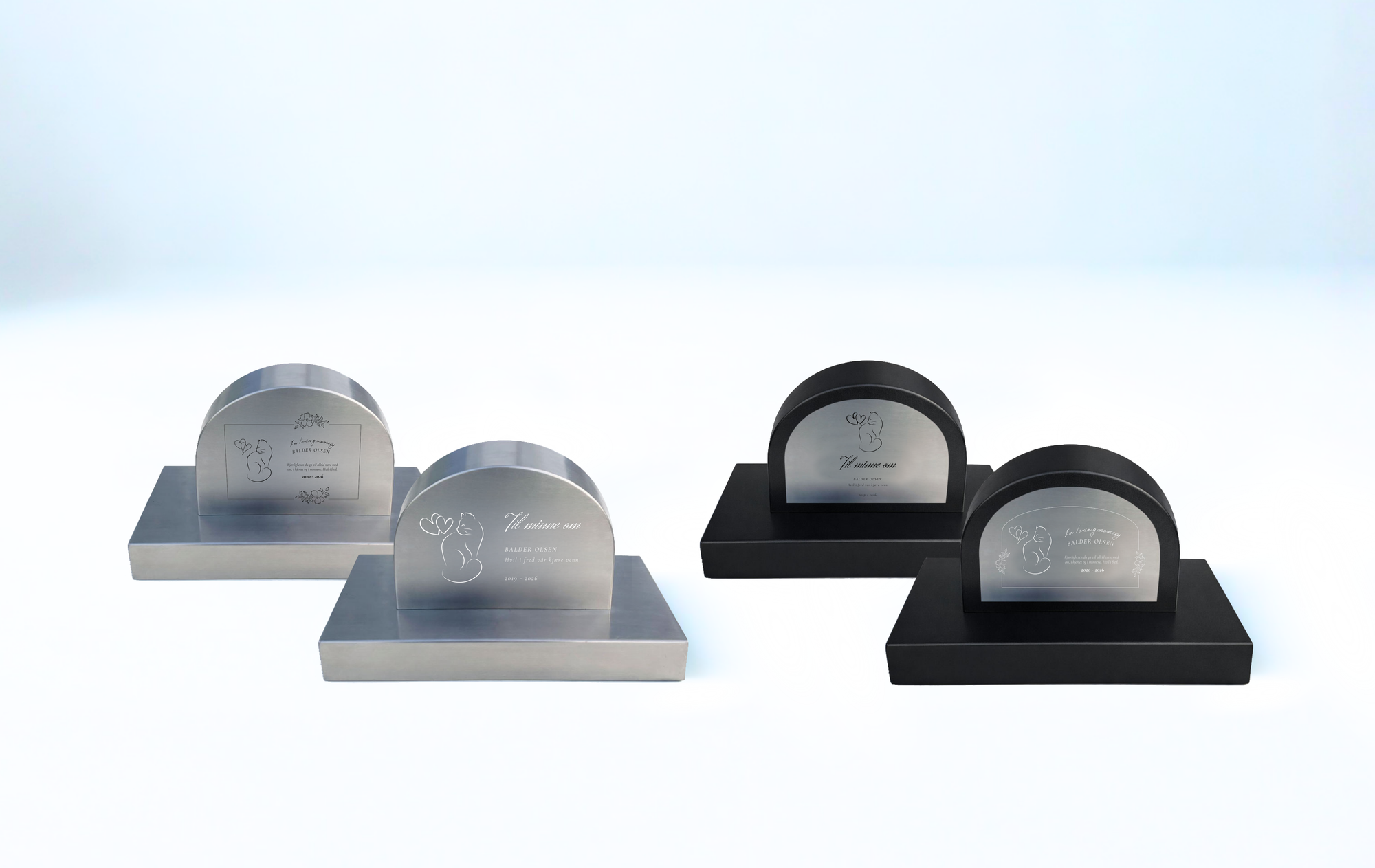 Vakre graverte gravstøtter i børstet stål og sort stål – skapt med kjærlighet for å hedre hunder, katter og andre kjæledyrs minner.